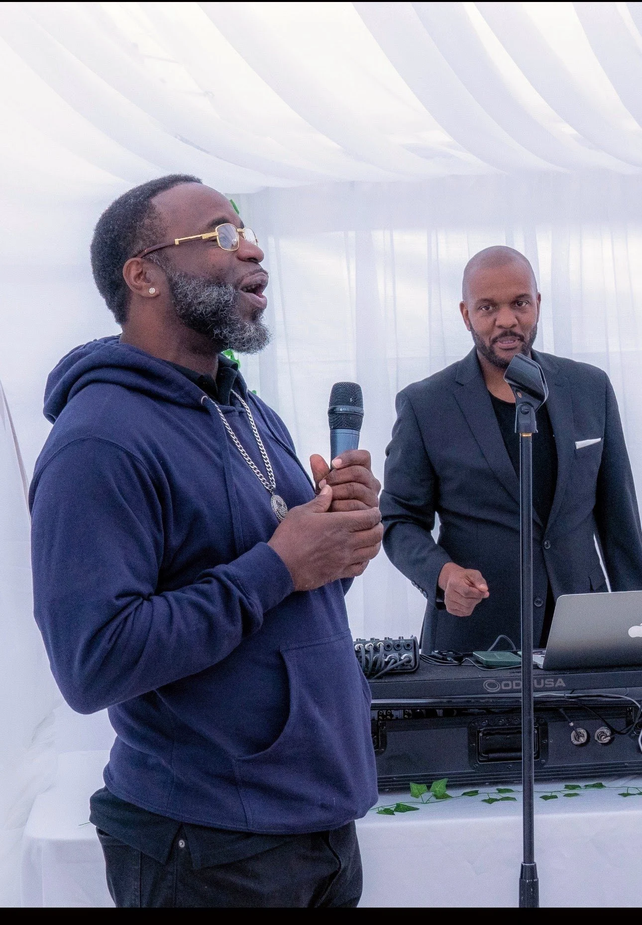 Two men are standing indoors in front of a white backdrop. One man in a blue hoodie is speaking into a microphone, while DJ Nate Murray, dressed in a black suit, stands behind the DJ setup, looking towards him. They appear to be discussing expert tips at an event.